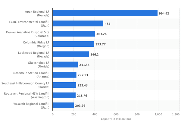 According to the data of 2024, the United States continues to rely on large-scale municipal solid waste (MSW) landfills to manage its growing waste production efficiently while adhering to environmental regulations. The largest landfills are primarily found in states with ample land availability and lower population densities, such as Nevada, Utah, and Florida. The Apex Regional Landfill in Nevada is by far the largest, with a massive design capacity of 994.92 million tons, more than double that of the second-largest landfill, ECDC Environmental Landfill in Utah (482 million tons). Other significant landfills include the Denver Arapahoe Disposal Site in Colorado (403.24 million tons), Columbia Ridge Landfill in Oregon (393.77 million tons), and Lockwood Regional Landfill in Nevada (346.2 million tons). Florida also has major waste facilities like the Okeechobee Landfill and Southeast Hillsborough County Landfill, each with capacities exceeding 200 million tons. These massive landfills highlight the ongoing need for large-scale waste disposal infrastructure, particularly in states with the necessary space and regulatory flexibility. However, regional waste management strategies vary, with some states investing more in recycling and waste-to-energy solutions to reduce landfill dependency. While the total number of active landfills has declined over the years, these high-capacity sites continue to play a crucial role in handling the nation’s waste efficiently (Statista, 2024).